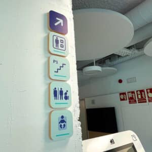 Orientació visual en espais físics. Creem sistemes de senyalització clars, accessibles i estètics per a oficines, museus, esdeveniments o espais comercials, assegurant la funcionalitat i la coherència de marca.